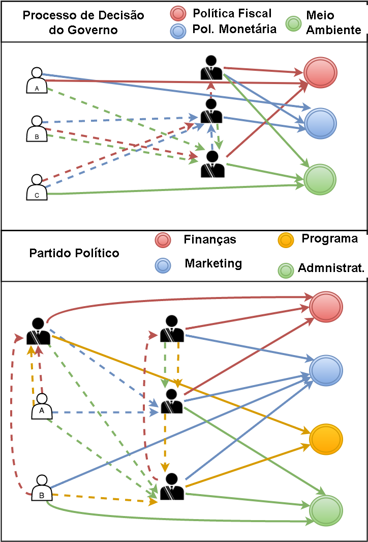 Deixe-me explicar o diagrama em mais detalhes, ele talvez seja um pouco confuso à primeira vista. Primeiro vamos esclarecer o diagrama relacionado ao Governo, que é muito semelhante ao diagrama do Partido Político. Do total de 6 votos, 3 assumiram a responsabilidade de ser um delegado. Como mencionado antes, existem 3 tipos de categorias (e, portanto, 3 áreas de especialidade): Política Fiscal, Política Monetária e Meio Ambiente.