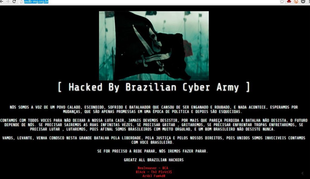 No começo da semana, o site do PT sofreu um deface* por grupo intitulado Anarchy Ghost e teve mensagens contra o governo publicadas em seus domínios. Agora, foi a vez de o site do PSDB de Minas Gerais passar pela mesma situação: na manhã desta quarta-feira, o grupo de nome Brazilian Cyber Army havia trocado a página inicial do site do partido pela imagem abaixo.